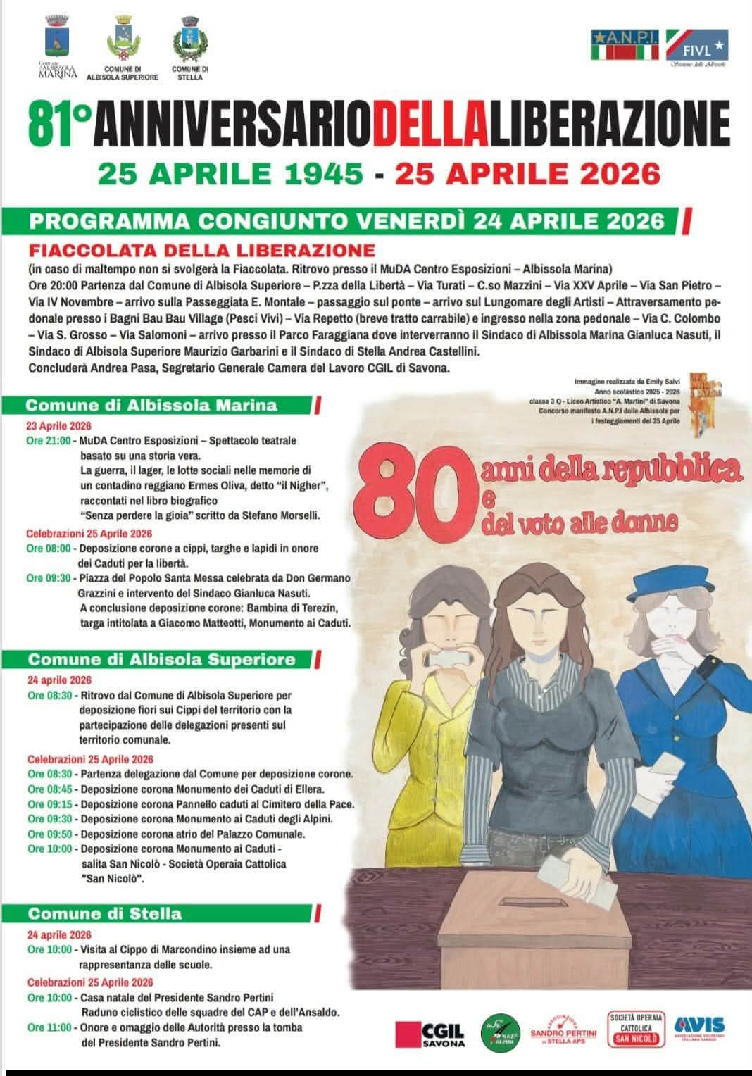 Il programma delle celebrazioni dell'anniversario della Liberazione vede la partecipazione congiunta dei Comuni di Albissola Marina, Albisola Superiore e Stella e iniziative nei singoli comuni.